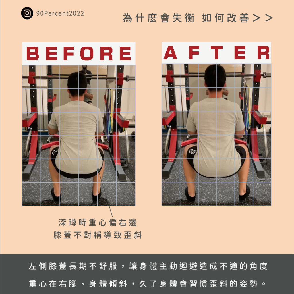 左側膝蓋不舒服,讓身體主動迴避造成不適的角度,從照片動作可以看到,學員重心放在右腳、身體傾斜,整體上下不平衡導致工作或運動中左右發力不平均,久而久之身體會習慣這種結構歪斜的姿勢。