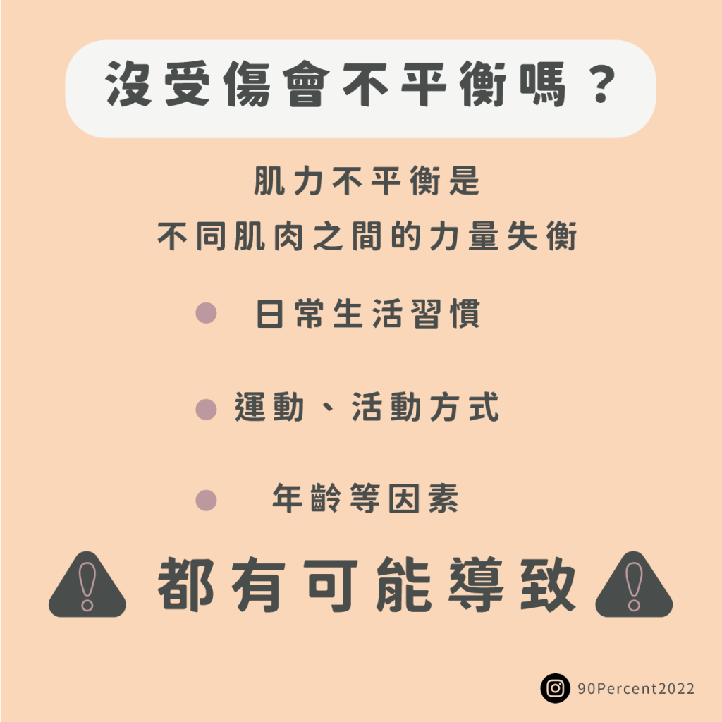 肌力不平衡指的是不同肌肉之間的力量失衡,即使沒有受傷,日常的生活習慣、活動方式、年齡等都有可能導致不平衡的狀況。