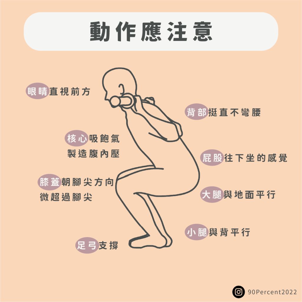 先前提到深蹲雙腳站姿與重心分布*,站姿調整後;下蹲時膝蓋腳尖方向微超過腳尖,背部不能彎腰或拱背,屁股往下坐到大腿與地面平行再順勢回到起始位置。