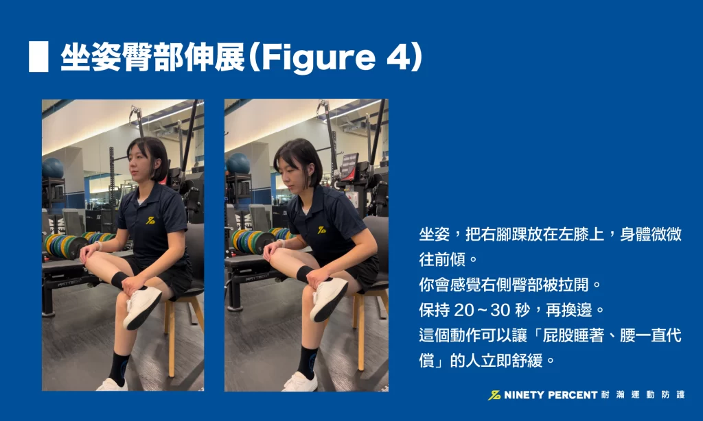 3. 坐姿臀部伸展(Figure 4)|打開臀肌與梨狀肌,減少腰椎代償