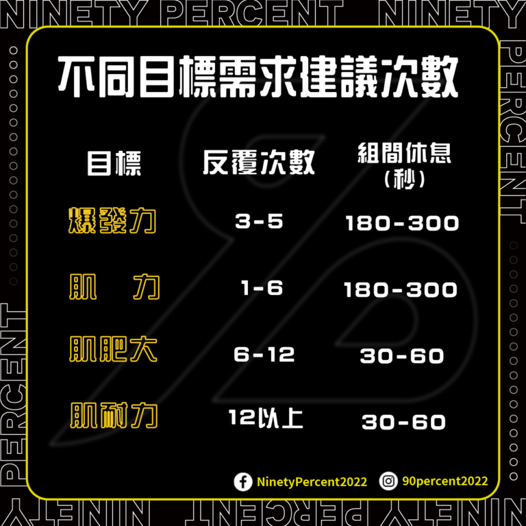 EX:如果今天目標是肌肥大,並把重量設定在6~12RM,假設1RM是100公斤,使用上表對應強度並取平均值為75%的重量去執行10下,如此就能得到75公斤為合適的重量。